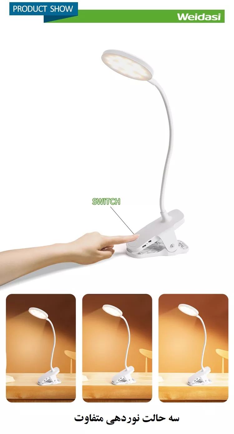 چراغ مطالعه ویداسی مدل 6051 یک چراغ مطالعه شارژی با طراحی مدرن و زیبا است. این چراغ دارای گیره نگهدارنده است که امکان نصب آن را روی میز کار یا تخت فراهم میکند. بدنه این محصول انعطافپذیر است و دارای کلید روشن/خاموش فیزیکی و لمسی است .