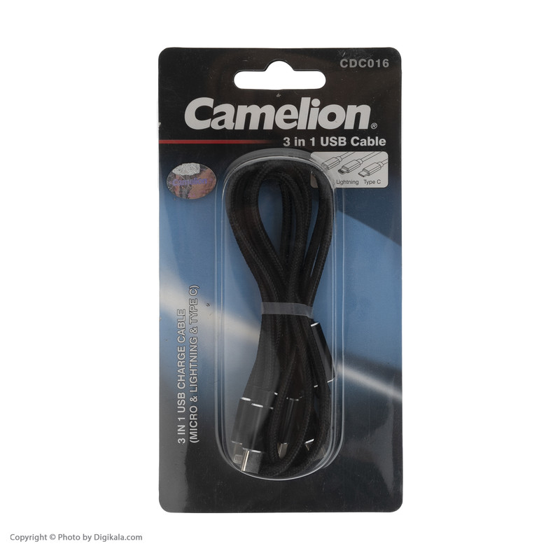 کابل تبدیل USB به microUSB / لایتنینگ / USB-C کملیون مدل CDC016 طول 1 متر در برابر گرما، شارژ و ولتاژ بیشازحد مقاوم است. این کابل شرکت کملیون برای شارژ و انتقال اطلاعات مناسب است. در یک طرف از این کابل ۱ متری کانکتور USB و در طرف دیگر کانکتورهای لایتنینگ، microUSB و USB-C وجود دارد و آن را برای محصولات اندرویدی و شرکت اپل مانند دستگاههای بلوتوثی مانند هدفونهای بیسیم و با تبلتها و گوشیهای موبایل مجهز به درگاههای یاد شده مناسب میسازد. برای استفاده از این محصول کافی است کانکتور USB آن را به شارژر یا پورت USB لپتاپ یا کامپیوتر متصل کنید و دیگر کانکتورهای آن را به پورتهای گوشی موبایل، تبلت یا دیگر دستگاه دیجیتالی وصل کنید. گفتنی است این محصول در طول ۱۰۰ سانتیمتر به بازار عرضهشده است. مقاومت در برابر گره خوردن و درهم پیچیدن و سرعت بالا در انتقال اطلاعات و شارژ از ویژگیهای این محصول شرکت کملیون است. یکی دیگر از ویژگیهای بسیار مهم کابل تبدیل USB به microUSB / لایتنینگ / USB-C کملیون مدل CDC016 این است که مانند کابلهای دیگر پوسیده نمیشود و دربرابر خمشدگی مقاومت بسیار بالایی دارد.