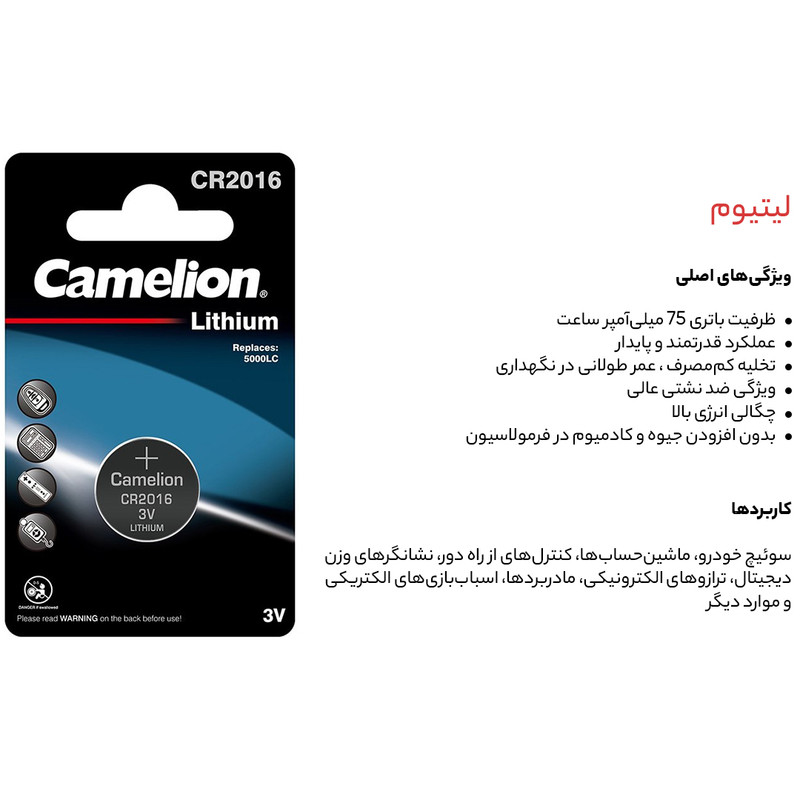 باتری سکه ای کملیون مدل CR2016 دارای قطر 20 میلی متر و ضخامت 1.6 میلی متر میباشد . بسته بندی این محصول به صورت کارتی بوده و تکنولوژی ساخت آن لیتیوم میباشد.
